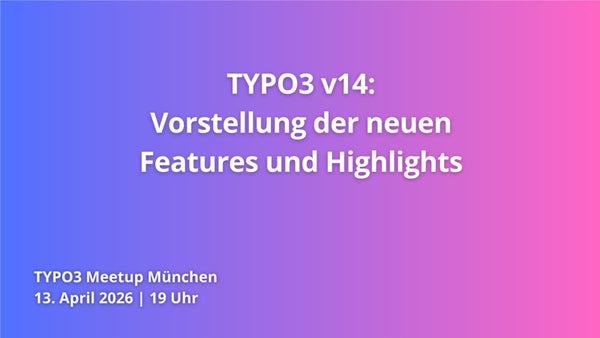 Save the date: am Montag, 13. April um 19 Uhr wird Garvin Hicking die Neuerungen und Highlights in TYPO3 v14 bei der Münchner TYPO3 User Group vorstellen. Das Treffen ist wie immer Remote.